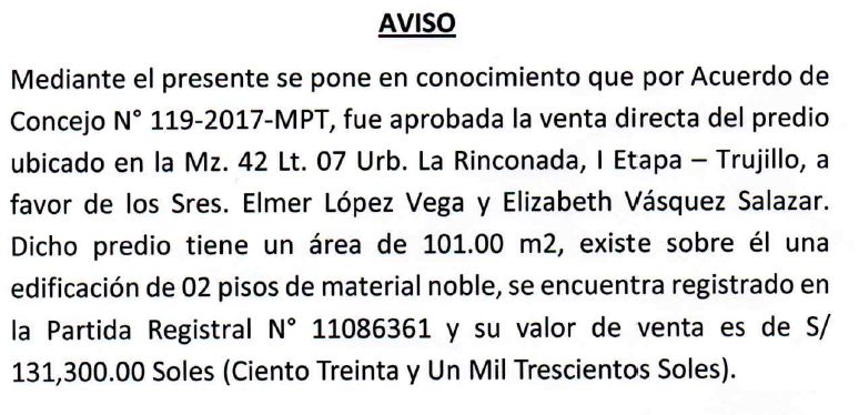 Mediante el presente se pone en conocimiento por acuerdo de concejo N° 119-2017-MPT, fue aprobada la venta directa del predio ubicado en la Mz. 42 Lt. 07 Urb. La Rinconada, I Etapa - Trujillo.