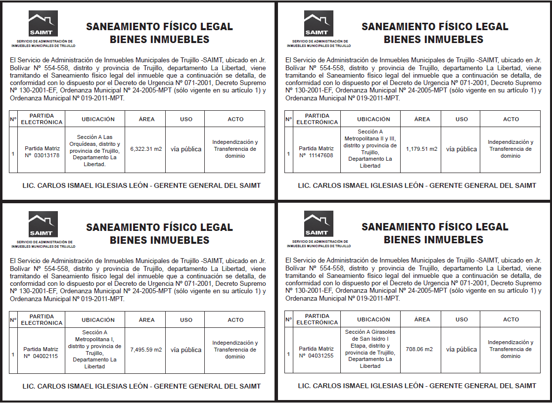 El servicio de Administración de Inmuebles Municipales de Trujillo - SAIMT, ubicado en Jr. Bolicar N° 554-558, distrito y provincia de Trujillo, departamento de La Libertad, viene tramitando........