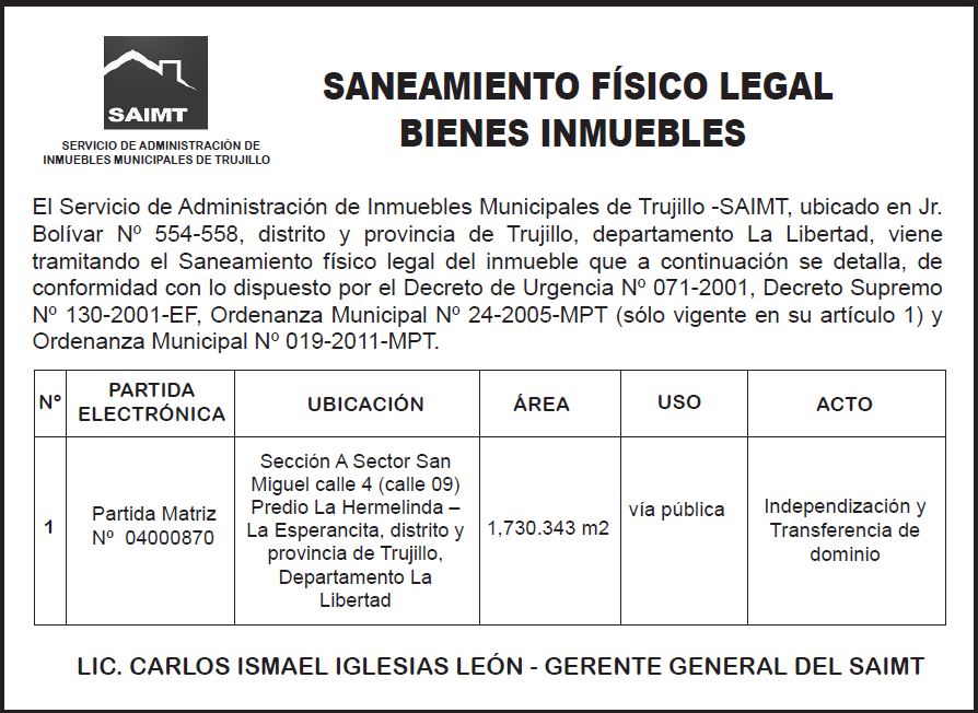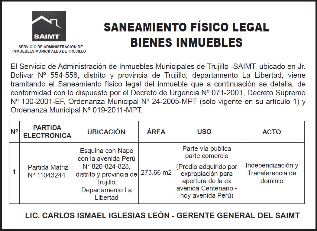 El SAIMT, ubicado en Jr. BolÃvar Nº 554-558, distrito y provincia de Trujillo, departamento La Libertad, viene tramitando el Saneamiento fÃsico legal del inmueble que a continuación se detalla.